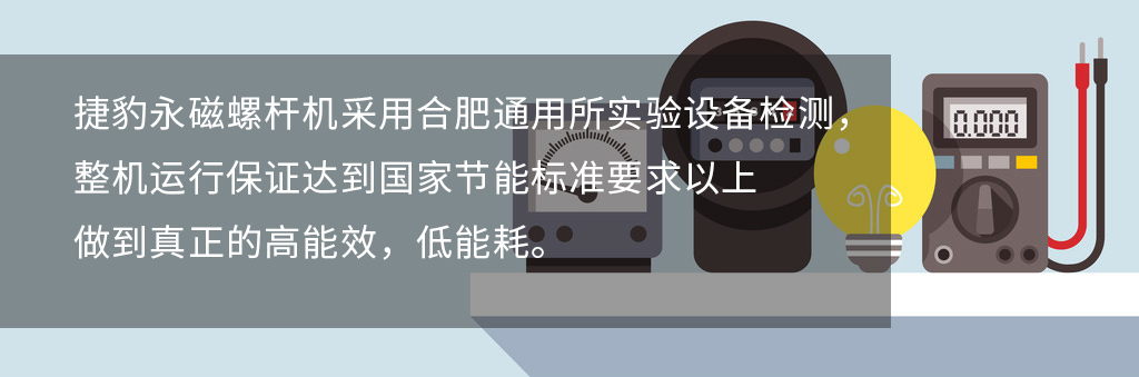 • 節能要求:隨著社會的不斷進步和科學的發展,節能已經越來越成為人們關心的話題。沒有高效節能效果,就算購買的空壓機再便宜,導致用電成本增高,那也是得不償失的;捷豹永磁螺桿機采用合肥通用所實驗設備檢測,整機運行保證達到國家節能標準要求以上,實現節能12%-20%,做到真正的高能效,低能耗。